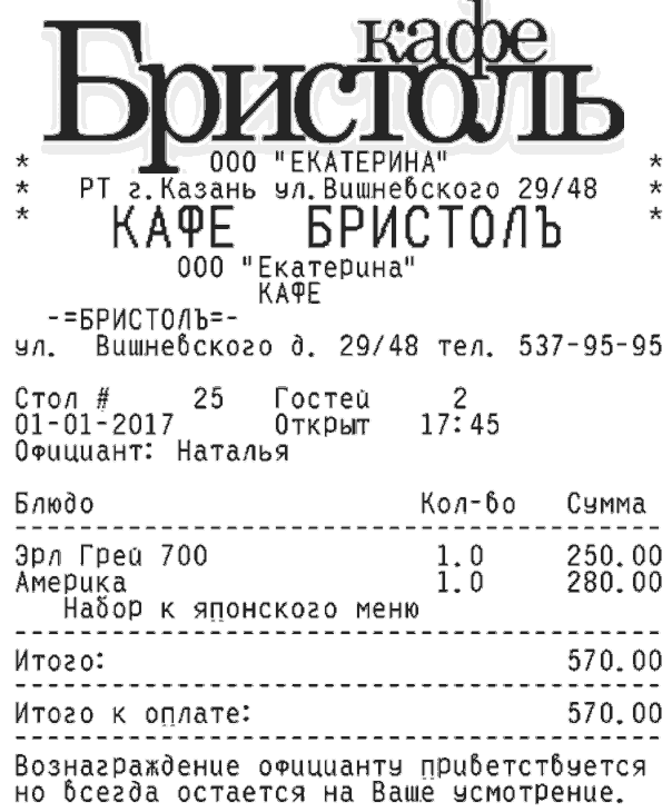 Чеки ресторана Казани один из популярнейших видов заказа, а это значит что у нас богатая база чеков и бланков счета ресторана. Ведь мы ведём свою деятельность уже более 6 лет.